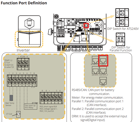 Please note if using a wireless meter such as the OBM meter the wirless receiver MUST be connected to the meter port and not the port labelled LoRa (this port is for the Sunsynk Wireless CT only.)