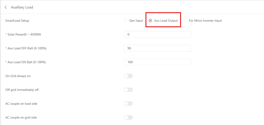 - Aux Load OFF batt – SOC percentage for when the GEN port will stop emitting power